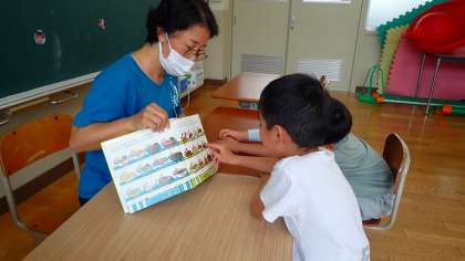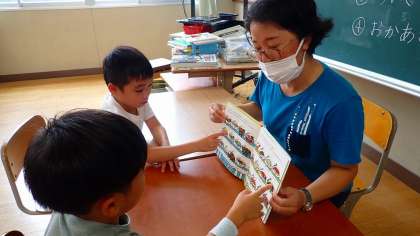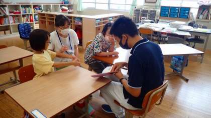 国語の学習では、先生のお読み聞かせを聞いた後、ひらがなの読み書きをしました。算数の学習では、さくらんぼ算を用いて、10を超えるたし算の練習に取り組みました。
