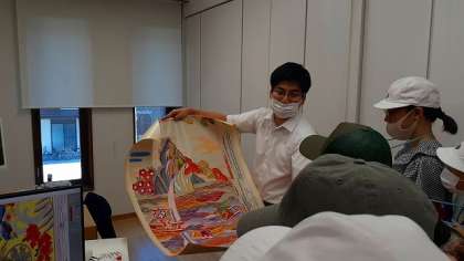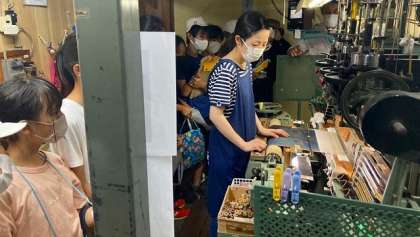 次に、「力織機」の見学をさせていただきました。手機とは違い、機械で織り進める力織機の動く速さに、子どもたちは驚いていました。また,機械といってもすべてをしてくれるのではなく,人の手で調整をしながら進めていかなければならないことも知りました。