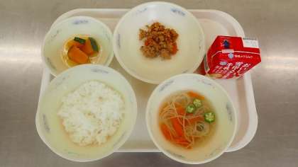 今日は、7月の和献立の日です。今月は七夕の行事献立を和献立にしました。「七夕そうめん」は、天の川に見立てた「そうめん」と、星に見立てた「オクラ」を入れて作りました。そうめんのおだしもとてもきれいで、おいしくいただくことができました。「かぼちゃの煮つけ」は、スチームコンベクションオーブンで作りました。かぼちゃのほくほくした食感とあま味を味わっていただきました。