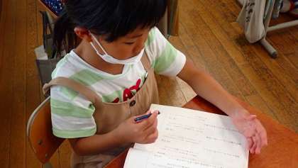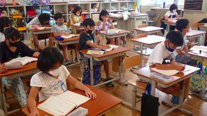 教科書に載っている短歌や俳句を聞き、「五・七・五・七・七」や「五・七・五」の切れ目を確かめたり、声に出して読んだりしました。