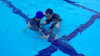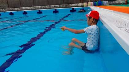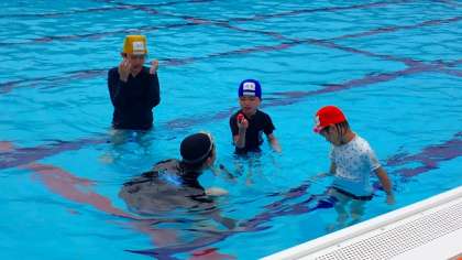 時間の後半には、「宝さがし」をしました。水に顔をつかないとキューブには手が届きません。先生にも助けてもらいながら、何とか拾おうと一生懸命がんばりました。