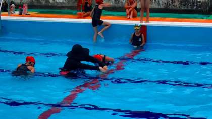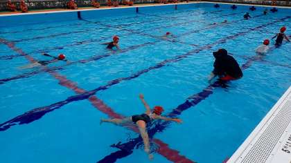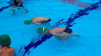 今日は、時間の後半は2つのグループに分かれて学習を進めました。顔をつけたり、いろいろな浮き方で水に浮いたりすることに挑戦するグループでは、碁石拾いをしたり、先生の腕の下をくぐったりしました。ずいぶん、水とも仲良くなれたのではないでしょうか。