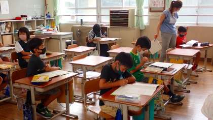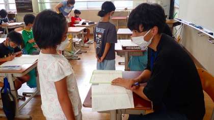 4年生の子どもたちは、先生のアドバイスを真剣な表情で聞いていました。先生に見てもらった子どもたちは、自分の座席でふり返りを書いていました。