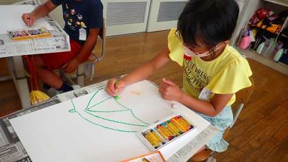 前回にかいた下絵をもとに、画用紙にパスで描いていきます。思いを広げて、大きな画用紙いっぱいに描きたい様子を表現していました。