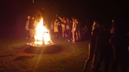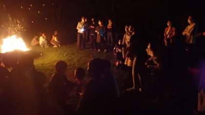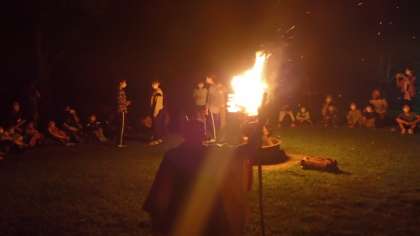 みんなで、キャンプファイヤを囲んで、出し物で盛り上がりました。それぞれの班で練習した出し物を順番に披露します。替え歌やコント、ゲームなどをしました。