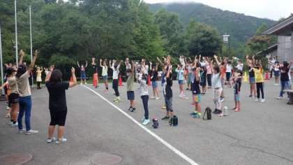 7時に玄関前に集合し、みんなでラジオ体操をしました。6年生の子どもたちが前に並んで、お手本をしてくれました。
