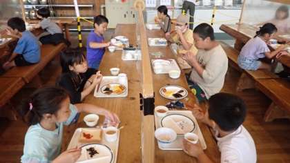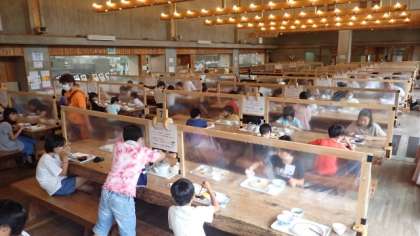 ラジオ体操の後は、食堂に集まって朝食をいただきました。自分が食べられる量をよく考えて、おかわりをしました。