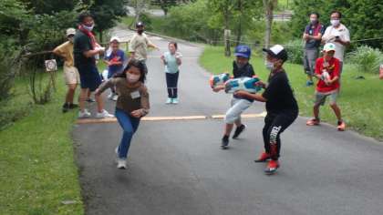 坂道の先の封筒には、クイズの問題、はずれカード、「ハンマーカード」の3種類のカードが入っています。クイズを引き当てて見事正解すれば終了、はずれカードを引いたらもう一度封筒を取りに行く、「ハンマーカード」を引いた場合も、もう一度封筒を取りに行きますが、その間は中学生のオニから水鉄砲の攻撃を受けます!