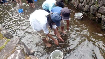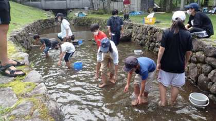 山の家の「おがま池」に放された魚を、制限時間内に何匹捕まえることができるかを競います。すばしっこく逃げ回る魚を追いかけて右往左往する子どもたち。上手に池の隅に追い込んで、魚を捕まえることができました。捕まえた魚は、この後の昼食の時間にいただきます。
