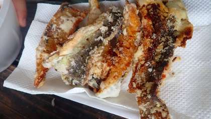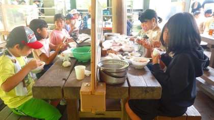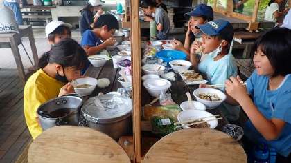 おにぎっりも、うどんも、岩魚のからあげも、どれもとてもおいしい昼食でした。さっきまで泳いでいた岩魚を上げて作ったからあげは、身はほくほく、衣はさくさくで、とびきりおいしいからあげでした。