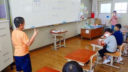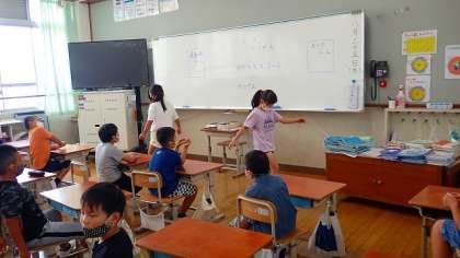2人が背中合せで立ち、「1・2・3」の掛け声に合わせて3歩あるいたかと思えば、ふり返って指で数字を作って互いに見せ合います。次の瞬間「49!」と大きな声。何をしているかというと、2人が立てた指の数をかけ算し、早く答えを言った方が勝ち、というゲームです。素早く「九九」が言えるかどうかが勝負の分かれ目です。ちゃんと答えられたかな?