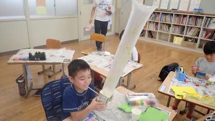 細長いビニル袋にストローをつけました。それを、牛乳パックや紙コップの中に固定して息を吹きこむと、中からビニル袋がむくむくと膨らんできます。ビニル袋に絵を描いたり、描いた絵を貼り付けたりして、楽しい作品を作りました。