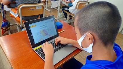 今日は、GIGA端末を使って、ローマ字入力のタイピングの練習をしました。両手の人さし指で入力するキーの位置を確認し、人さし指だけで入力に挑戦しました。