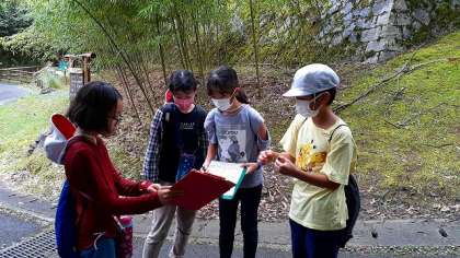 「鳥の声」「あしあと」「きのこ」などの「自然の宝」が書かれたビンゴシートを手に、グループで山の家の周りを散策します。