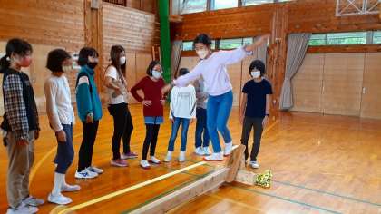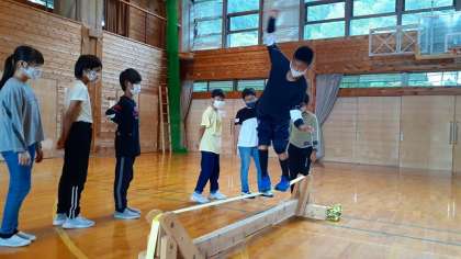 また、「スラックライン」にも挑戦させていただきました。ピンと張った細くて平らなベルト状のラインの上を、バランスを取ってあるきます。体幹が強くないと、バランスを保つのが難しそうです。みんな、挑戦を楽しんでいます。