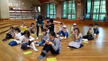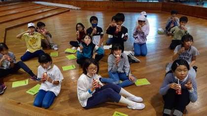 クラフトづくりが終わった後は、ちょっと休憩タイムです。みんなで一緒にジュースを飲みました。みんな元気にしています。
