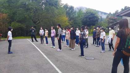 ここからは2日目の様子です。7時から、玄関前の広場で「朝の集い」を行いました。