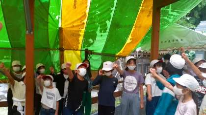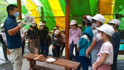 「火」は、どのようにしておこすのでしょうか。山の家では、「まいぎり式」の火おこし器を使って火をおこしますが、実際に、山の家の所員の先生に見本を示していただきます。見ての通り、決して一人ではできない作業です。グループのみんなの協力が大切ですね。