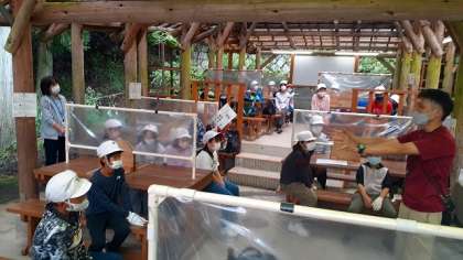 野外炊事が始まっています。はじめに、説明を聞いてから、それぞれの係に分かれて準備を進めていきます。