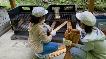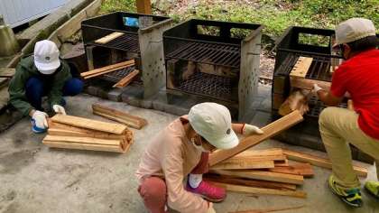 「かまど係」の子どもたちは、かまどに木を組んでいきます。どんな組み方をするとよいかな?