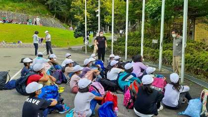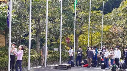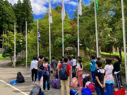校歌を聴きながら、校旗を降ろします。これで山の家ともお別れと思うと、少し寂しい気持ちになってしまいます。2日間お世話になった所員の方からのお話を聞き、感謝の気持ちを伝えました。