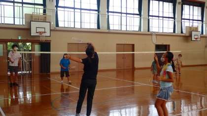 今日もたくさんの子どもたちがやってきました。用意していただいたバドミントンのコートや卓球台でなかよく活動しました。6年生の子どもたちは、担任の先生と一緒にバドミントンをして楽しんでいました。