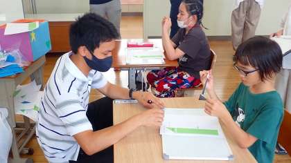 次に、示された形の中に三角形がいくつかくれているかを考えました。三角形の色板を使って区切っていき、隠れた三角形の数を考えました。