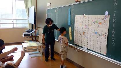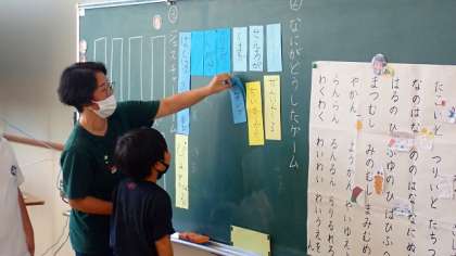 主語と述語のカードを組み合わせ、できた文が意味の通る文になっているかみんなで考えました。組み合わせによっては、思わず吹き出してしまうような文ができましたが、子どもたちは、「ブーっ!」と教えてくれました。
