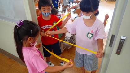 机が教室の出入口のドアを通るかを調べるために、机の横幅と同じ長さにテープを切って、そのテープを使って調べています。他にも、いろいろなものの長さとどちらが長いかに興味をもち、いろいろと比べていました。
