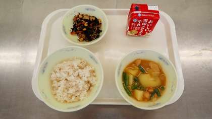 「鶏肉と野菜の煮つけ」は、鶏肉と、じゃがいも、たまねぎ、にんじん、三度豆を煮ています。たまねぎの甘みがよく出ていて、とてもおいしくいただきました。「ひじき豆」は、あぶらあげにもだしの味がよく染みこんでおり、ごはんによく合いました。