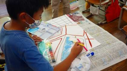 コンテを使って線描して、パスや絵の具を使って彩色していきます。想像をふくらませた場面の様子を一生懸命に描いています。