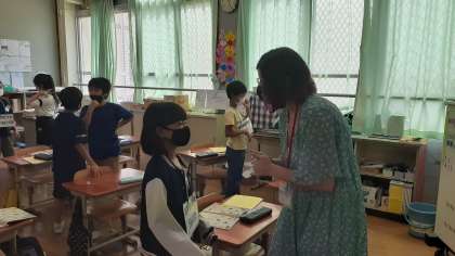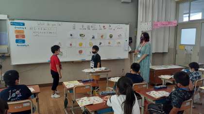 今日は、ALTの先生と一緒に 身の回りのものの言い方や ”What do you like ?” ” I Iike 〜.”の言い方を使って、好きな色や食べ物についてのやり取りを楽しんでいました。