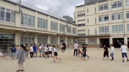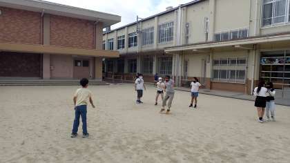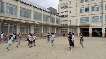 台風の通過で涼しくなった運動場では、6年生が「大なわの8の字跳び」に挑戦していました。早く出てきた子どもたちから始まり、どんどん参加する子が増えていきました。