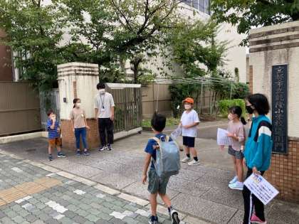 今日は、たてわり19・20グループの子どもたちが「朝のあいさつ運動」に取り組みました。