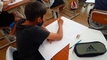 描きたい場面の様子を決め、画用紙に下描きを進めています。葉の1枚1枚までていねいに描く姿は、さすが6年生です。そろそろ絵の具を使って彩色を始める子もいるようです。