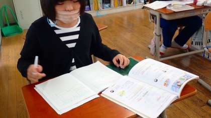 4年生の教室では、交流学習で算数の学習をしています。図に表しながら、どんな式で求めるとよいかを考えていました。