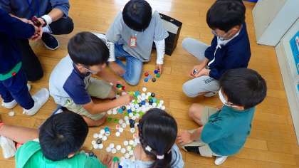 ご家庭に協力いただいて集まった山盛りの材料を使って、いろいろな遊びを試しています。「はじく」「つむ」など、どんな遊び方がおもしろいかを考え、実際にやってみることでより楽しい遊びを発見しています。