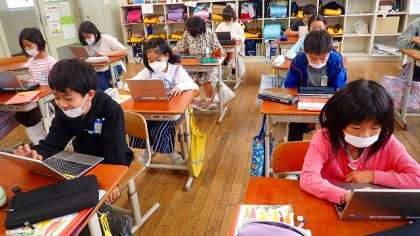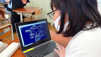 「秋」から広げたイメージをみんなで交流しています。GIGA端末を活用して、友達が書いたものを互いに見合っています。