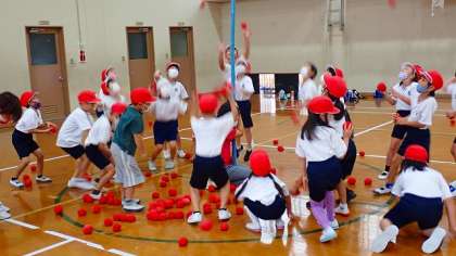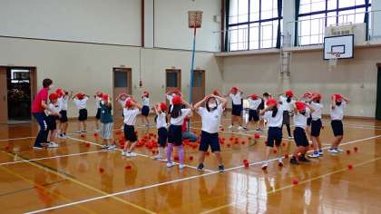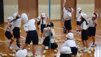 雨で運動場が使えなかったので、体育館で「チェッコリ玉入れ」の練習をしました。今日は実際に玉入れのかごを用意して、玉入れを行いました。みんな一生懸命に踊り、玉入れも必死に取り組んでいました。