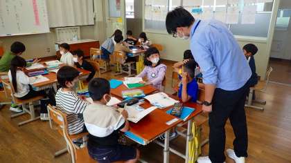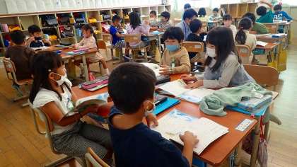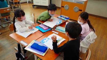 グループで、音読の役割分担を決めて音読発表会をします。「くじらぐも」「先生」「子どもたち」「ナレーター」の4つの役を、誰がするのかを決めました。役割が決まったら、音読練習スタートです。元気いっぱいの1年生らしい声で、音読を始めました。発表会が楽しみですね。