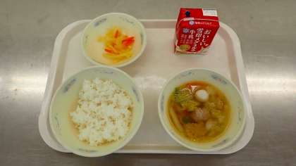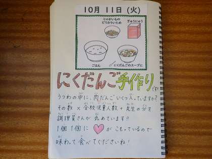「肉だんごのスープ煮」には、給食調理員さんがひとつひとつ手作りで作ったくださった肉だんごがたっぷり入っています。ほんのりとしたしょうがの風味の、もちもちしたとてもおいしい肉だんごです。白菜やにんじんなど、たくさんの野菜と一緒においしくいただきました。