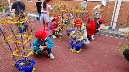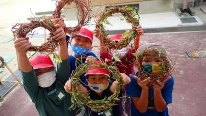 これまで、水やりをして一生懸命育ててきたあさがおですが、たくさん種が取れました。枯れてしまった「つる」ですが、このまま捨ててしまうのではなく、抜いたあと、「リース」を作ることになりました。小さな種から育てたたいせつな自分のあさがおを植木鉢から抜いて、つるが切れてしまわないようにていねいにほどいていきます。ほどいたつるを輪にして、かわいいリースができあがりました。