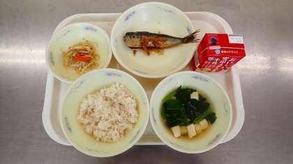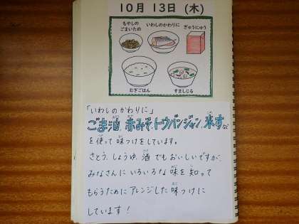 「いわしのかわり煮」は、いわしを、ごま油、赤みそ、トウバンジャン、米酢などを使って味付けしています。いわしの身にしっかりと味がしみこみ、とてもおいしいいわしでした。今日の「すまし汁」は、減塩献立です。塩味が少ない分、いつもよりだしの味が感じられるおいしいすまし汁でした。