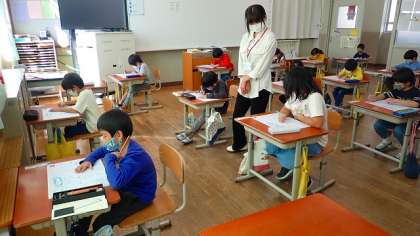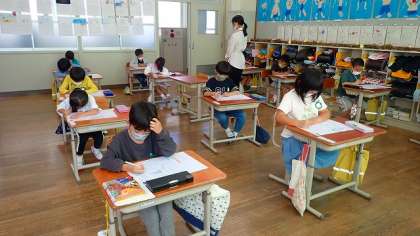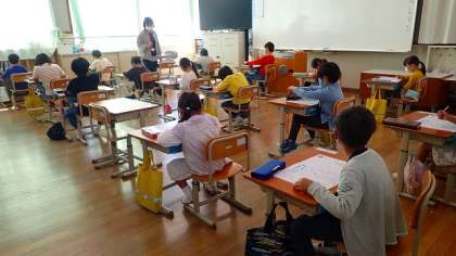 今日は、単元の学習をふり返る評価テストを実施しました。これまで学習したことを思い出しながら、真剣な表情で問題を解いています。字も、しっかりていねいに書いている姿が立派でした。