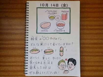 今日は子どもたちの大好きな「ツナサンド」の日ですが、いつものツナサンドとは違い「フレンチ味」のツナサンドでした。いつもはマヨネーズを和えますが、今日はオリーブオイルのによる味付けで、食材の味を感じながらおいしくいただきました。