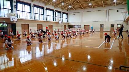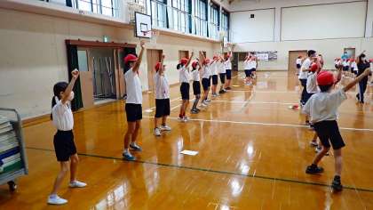 体育館では、赤組が練習しました。全校ダンスの曲に合わせて、みんなで一緒に踊りました。