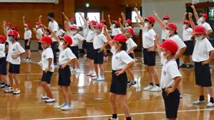 2校時に、あと1週間に迫った運動会に向けて全校練習を行いました。あいにくの雨になってしまったため、体育館と4階多目的ホールに分かれて、準備運動(全校ダンス)と応援練習のみ行いました。
