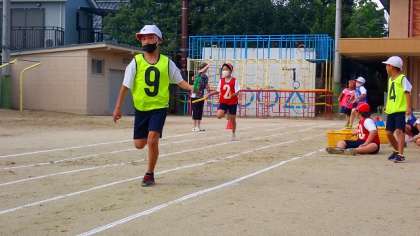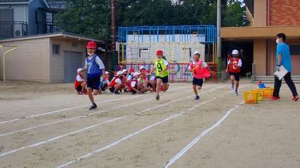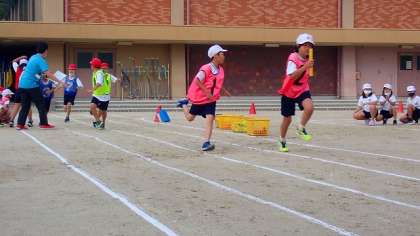 リレーの練習の様子です。チームで走る順番を決め、バトンパスの練習もしました。練習の成果を試すために、実際に競走しました。子どもたちは、「テイクオーバーゾーン」を意識してリードをとってバトンパスをしていました。