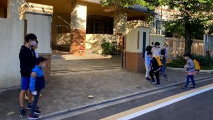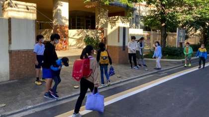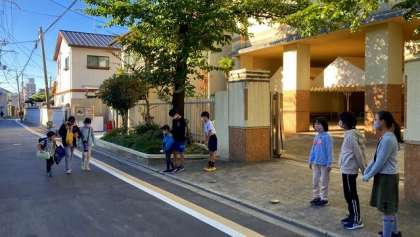 今日は、たてわりグループでのあいさつ運動の日です。7・8グループの子どもたちが正門と通用門に分かれてあいさつをしました。