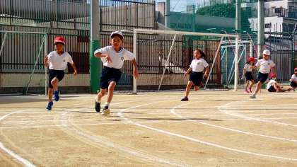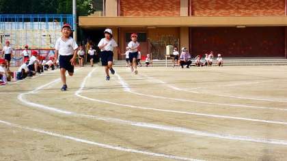 80m走の最後練習です。コーナーでは、なるべくスピードを落とさずに、自分のコースを守って走ることが大切です。本番では、力いっぱい走る姿に、あたたかい声援をお願いします。